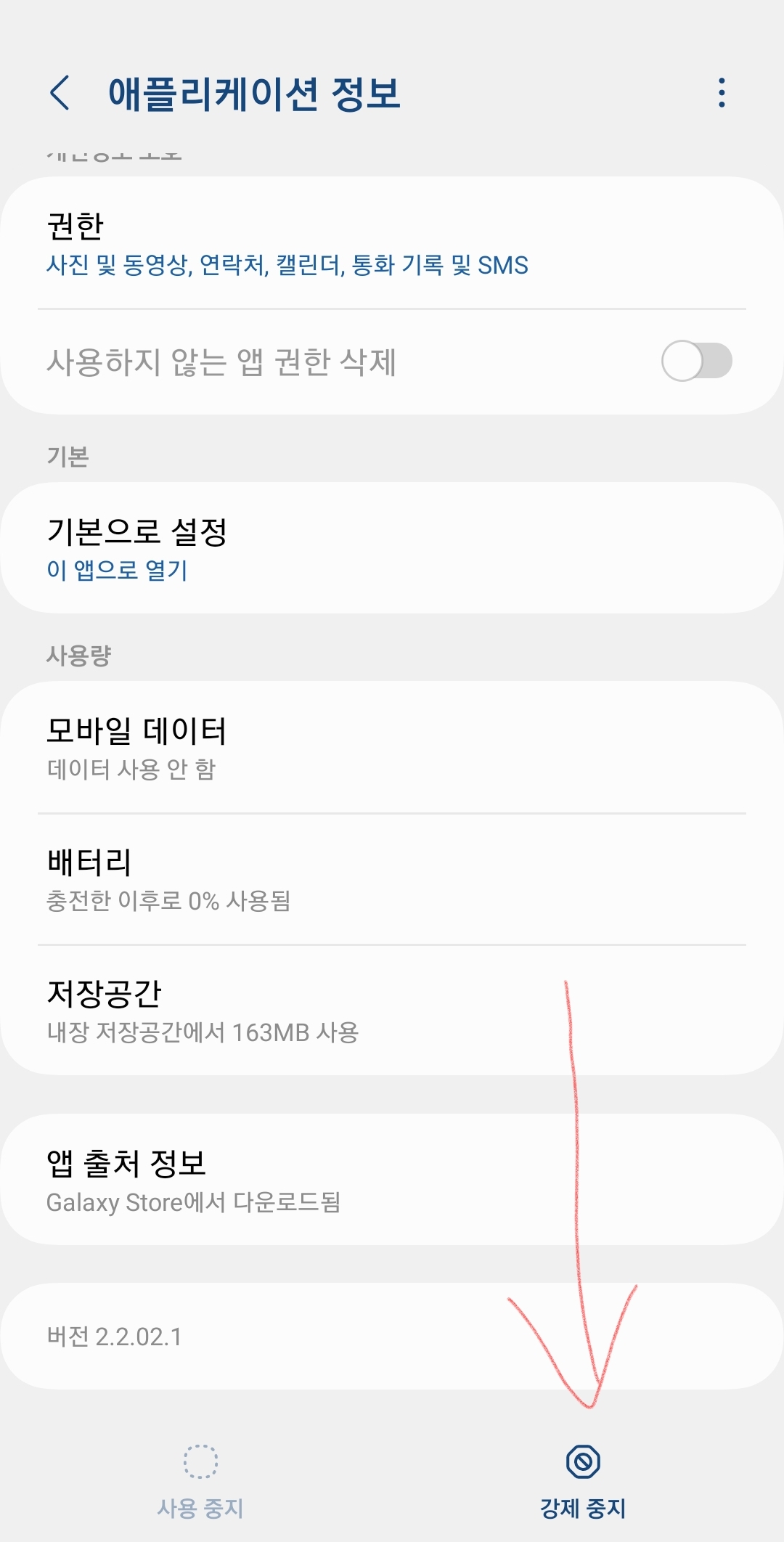 그리고나서 다시 뒤로가기 눌러서 나오신다음, 강제중지를 해줍니다. 강제중지를 누르면 뭐 초기화 어쩌구하면서 알림이 뜨실텐데 그냥 무시하고 중지 시켜줬습니다.